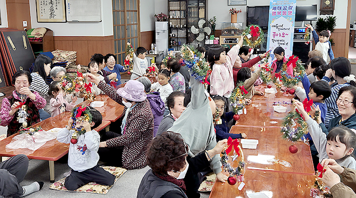 (사)대한노인회 제주시지회(회장 문준식)는 지난 13일 경로당세대통합프로그램지원사업으로 건입동경로당(회장 김추자)에서 공립건입동어린이집(원장 현경숙) 원아들과 함께 크리스마스 원형 트리 만들기를 진행했다.