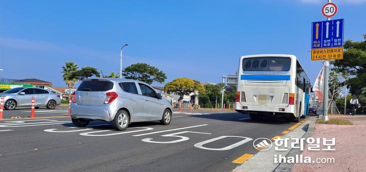 [한라일보] 제주공항 입구인 해태동산에서 광양사거리로 이어지는 제주시 서광로 구간에서의 버스전용차로 위반이 최근 급증하고 있다. 특히 제주형 간선급행버스체계(BRT) 고급화 사업에 따라 올해 양문형 저상버스 전용 '섬식정류장'이 설치된 이후, 위반 사례가 크게 늘며 교통안내시설 보강·조정 및 차로 설계 변경 등에 대한 요구가 잇따르고 있다.