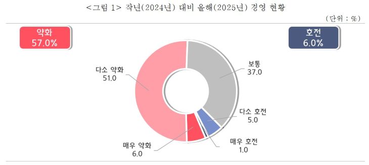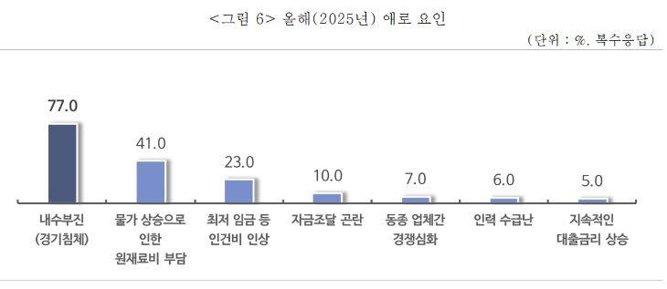 올해 경영 애로 요인(복수응답)으로는 '내수 부진(경기 침체)'이 77%로 가장 많이 지목됐다. 이어 '물가 상승으로 인한 원재료비 부담(41%)', '최저임금 등 인건비 인상(23%)' 순으로 꼽혔다. 내년 예상되는 애로요인 1순위도 '내수 부진(경기 침체)'(73%)으로 나타났다.