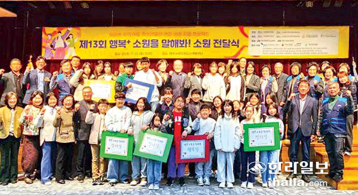 제주시 아라동지역사회보장협의체(공동위원장 현치하·양순종)는 지난 22일 '제13회 행복+소원을 말해봐' 소원편지 응모 학생과 가족, 지역 후원자 등 100여 명이 참석한 가운데 소원전달식을 개최해 ▷최우수상 3명 ▷우수상 3명 ▷장려상 5명 ▷행복상 28명 등 수상자들에게 소정의 소원선물을 전달했다.