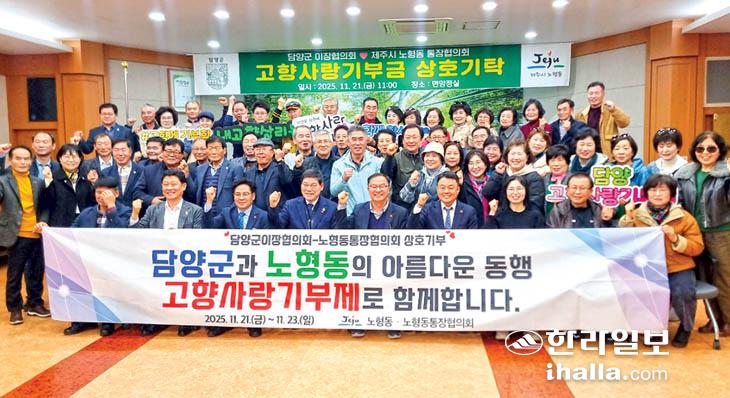 제주시 노형동통장협의회(회장 현상진)는 지난 21일 전남 담양군이장협의회(회장 정용오)와 지역 간 우호 협력과 상생 발전을 위해 고향사랑기부금 620만원 상호기탁식을 진행하며 지역사랑 실천과 기부문화 확산에 함께했다.