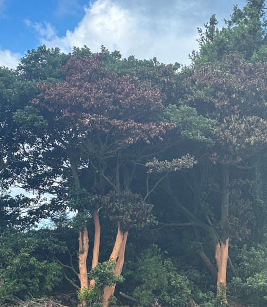 박피된 후박나무에 황토를 발라 응급처치했으나 일부 나무들은 고사가 진행되고 있다. 제주자치경찰단 제공