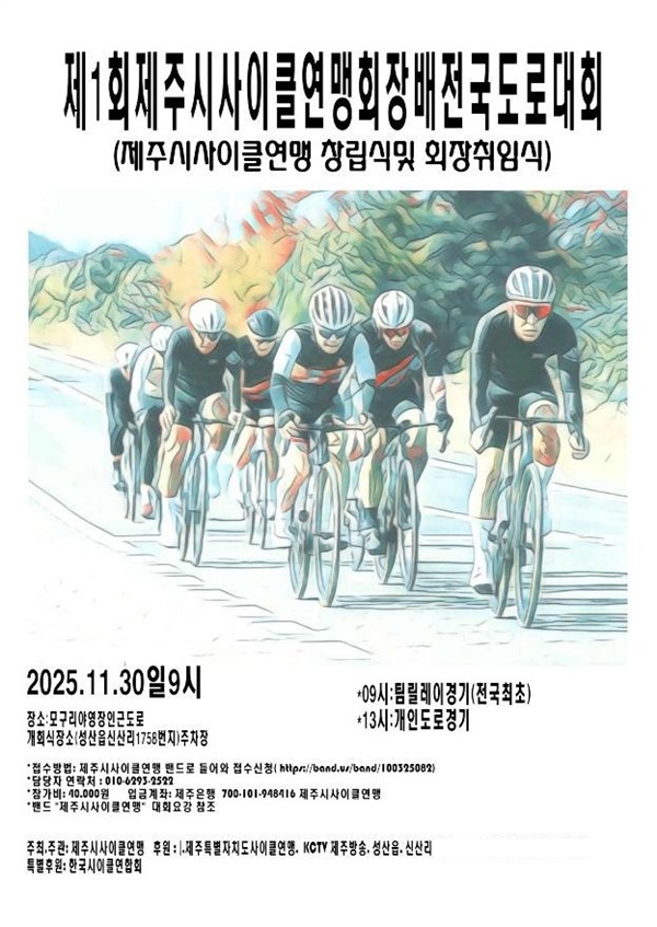 제주시사이클연맹 창립식 및 회장 취임식을 겸한 이번 대회는 전국 6개 시·시도 생활체육 사이클 동호인 100여명이 참가, 열전을 펼친다.