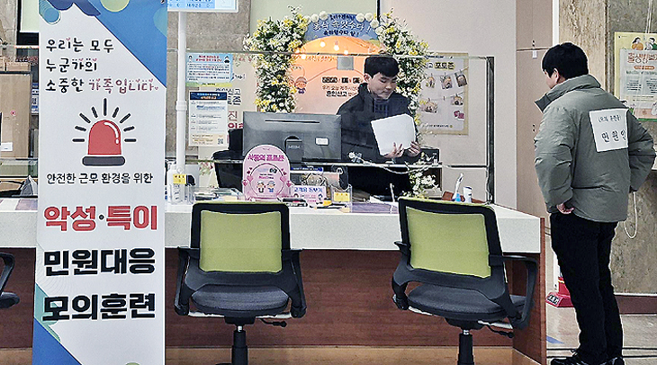 모의훈련은 민원인의 격한 항의와 폭행 등 위기상황 발생을 가정해 ▷진정 및 중재 ▷음성·영상 증거 확보 ▷방문객의 안전 대피 ▷가해 민원인 경찰 인계 등의 절차로 진행했다.