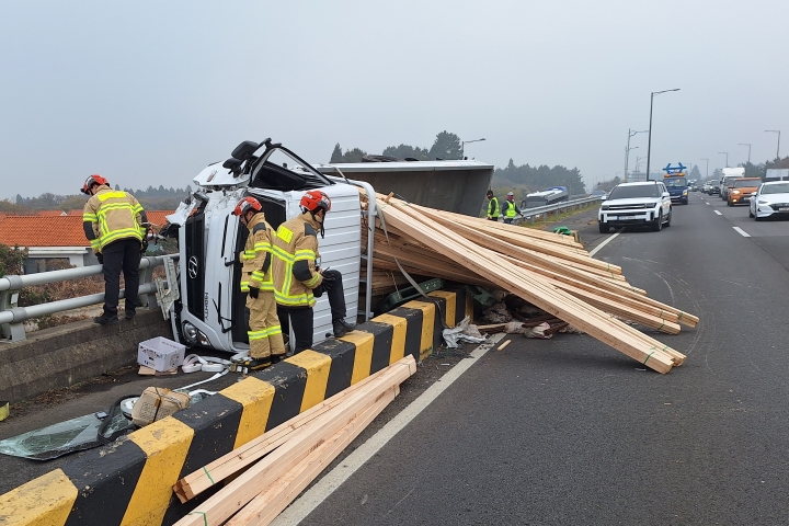 1일 오전 제주시 애월읍의 평화로에서 3.5t 트럭이 전도되는 사고가 발생했다. 제주소방안전본부 제공