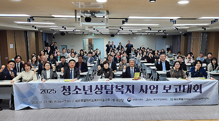 제주도청소년상담복지센터(센터장 양명희)는 지난달 27일 '2025년 청소년상담복지 사업 보고대회'를 개최해 ▷청소년상담복지 사업 성과 보고 ▷우수청소년·지도자 시상 ▷특별 공연 및 강연 등을 진행했다.