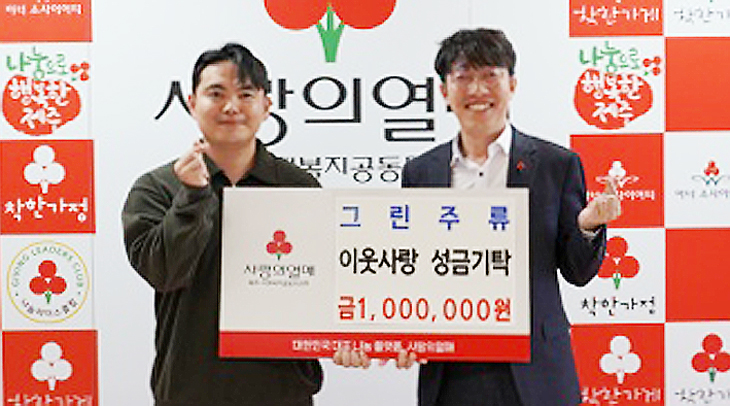 제주도 주류 유통 기업 유한회사 그린(대표 채수용)은 최근 사랑의열매 나눔실에서 연말을 맞아 성금 100만원을 제주사회복지공동모금회(회장 강지언)에 기탁했다.