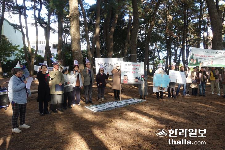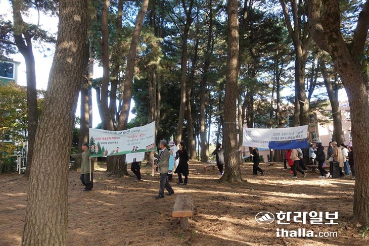 5일 오후 시민들이 '서귀포의 아들 오영훈 도지사님, 100년 곰솔숲의 지킴이로 역사에 남아주세요'란 문구가 적힌 현수막을 들고 서귀포학생문화원 소나무 숲과 그 주변을 행진하고 있다.