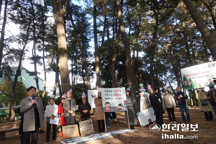 5일 오후 오영훈 지사의 현장 방문 전 서귀포학생문화원 잔디광장과 소나무 숲을 관통하는 도로 개설에 반대하는 시민들이 발언하고 있다.
