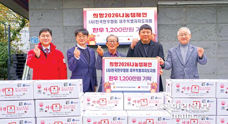 사단법인 전국한우협회 제주특별자치도회(지회장 박창석)는 지난 4일 전국한우협회와 한우자조금의 후원으로 진행되는 '한우 농가의 따뜻한 나눔행사'의 일환으로 도내 소외계층을 위해 1200만원 상당의 한우를 제주사회복지공동모금회(회장 강지언)에 기탁했다.