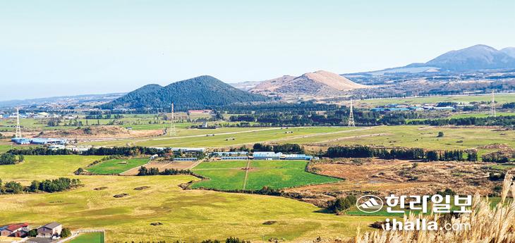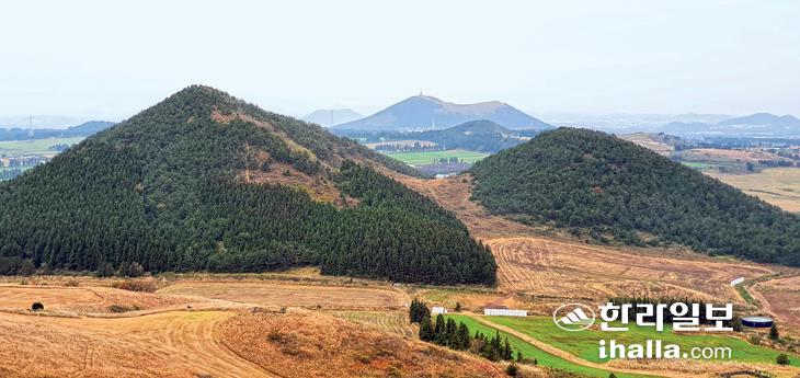 이달오름, 두 개의 오름이 이어진 것처럼 보인다. 멀리 정면에 보이는 오름은 금오름.