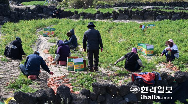 [한라일보] 8일 당근 주산지인 제주시 구좌읍 김녕리 한 농경지에서 농민들이 당근을 수확하고 있다. 강희만기자