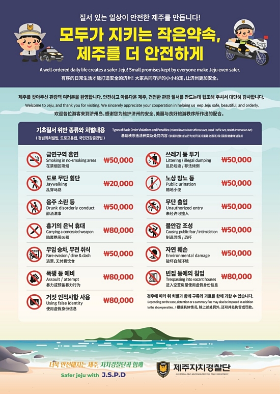 여행업계를 통한 간접 홍보도 병행했다. 자치경찰단은 도내 종합여행사 399곳과 관광호텔 22곳 등 총 421개 업소에 외국인 관광객 기초질서 준수 안내 협조 서한문을 발송했다.