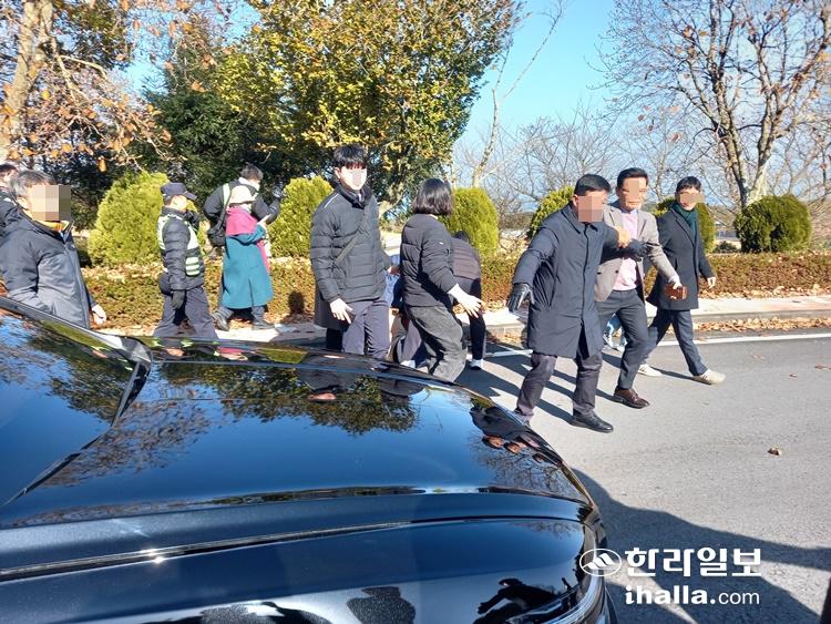 행사장을 떠나는 오영훈 도지사의 차를 가로막다 제지당하는 반대 측. 오소범 기자
