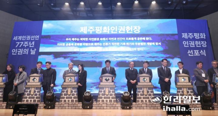 제주도는 10일 제주4·3평화공원에서 ‘세계인권선언 77주년 인권의 날 기념식’을 열고 제주평화인권헌장을 공식 선포했다. 연합뉴스