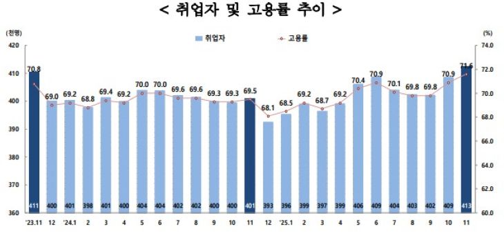 국가데이터처 제주사무소가 10일 발표한 '2025년 11월 제주특별자치도 고용동향'에 따르면 지난달 제주지역 15세 이상 취업자 수는 41만3000명으로 전년 동월 대비 1만1000명(2.8%) 증가했다. 월별 추이로 보면 2022년 11월(41만6000명) 이후 3년 만에 가장 많은 수준이며, 증가 폭도 2022년 12월(1만9000명) 이후 가장 컸다. 고용률도 1년 전보다 2.1%포인트(p) 상승한 71.6%로, 3년 만에 가장 높은 수준을 나타냈다.