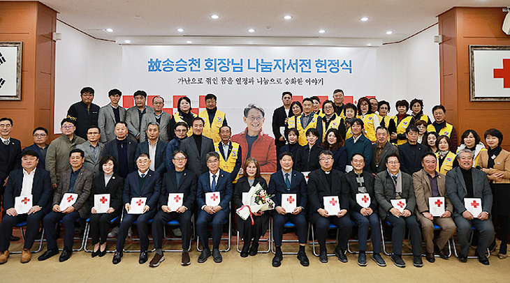 대한적십자사제주특별자치도지사(회장 정태근)는 지난 9일 제주적십자사 나눔홀에서 故송승천 회장의 나눔자서전 '가난으로 꺾인 꿈을 열정과 나눔으로 승화한 이야기' 헌정식을 개최했다.