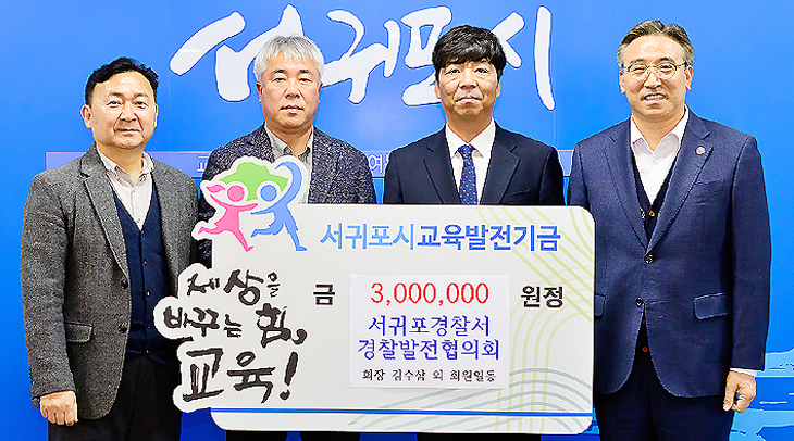 서귀포경찰서 경찰발전협의회(회장 김수삼)는 지난 8일 서귀포시청에서 (재)서귀포시교육발전기금(이사장 김문수)에 교육발전기금 300만원을 기탁했다.
