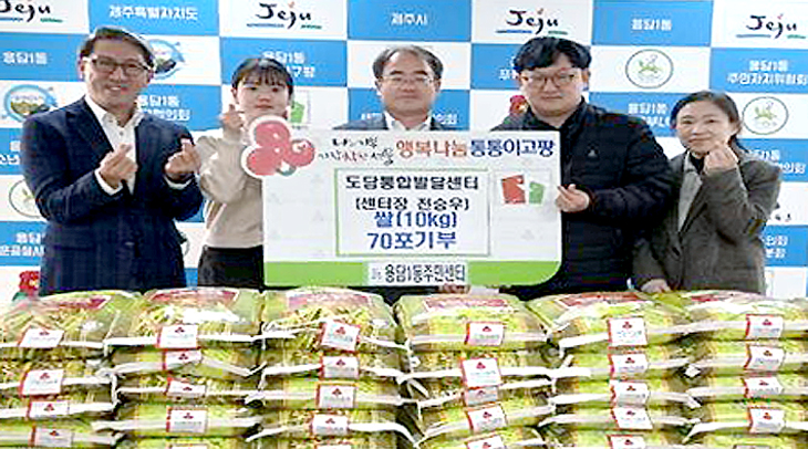 도담발달지원센터(센터장 전승우)는 지난 8일 제주시 용담1동주민센터를 방문해 지역 내 취약계층을 위한 쌀(10㎏) 70포를 기탁했다.