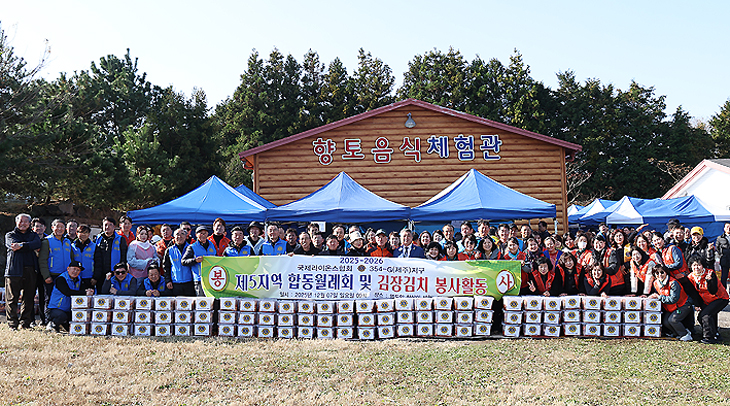국제라이온스협회 354-G(제주)지구 제5지역 라이온스(위원장 양재웅)는 지난 7일 명도암 참살이 체험농장에서 회원 등 350여 명이 참석한 가운데 '제5지역 합동월례회 및 김장김치 봉사활동'을 전개해 김치 1000포기를 지역 내 소외계층에 전달했다.