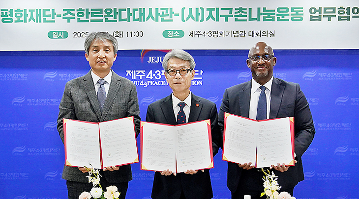 [한라일보] 제주4·3평화재단과 주한 르완다공화국 대사관, (사)지구촌나눔운동은 지난 9일 제주4·3평화기념관 4층 대회의실에서 '기억과 화해, 평화를 위한 3자 업무협약(MOU)'을 체결했다.