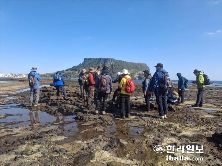 언제 봐도 경이로운 성처럼 우뚝 선 일출봉이 코앞에 보였다. 신양리 앞 바다에 하차를 하고 출발하였다. 안내자는 곶과 만이 조화로운 신양리 해수욕장을 경유하며 행정구역과 설촌 유래에 대해 설명하였다. 신양리가 고향이기도 한 그는 어릴 적 추억담을 곁들이며 생생한 이야기보따리를 풀었다. 원형이 잘 남아 있는 '불턱'(해녀들이 쉬는 곳) 앞에서, 해녀이셨던 어머니의 모습을 떠올린다. 지금처럼 고무 옷이 없는 시대에 거센 바다에서 물질하던 강인한 어머니 모습을…. 집중하며 듣는 참가자들이 질문을 받으며 볼레출(보리수나무) 동산에 이르렀다. 우둑우둑 서 있는 바위위에서 용암이 흐른 과정을 듣는다.