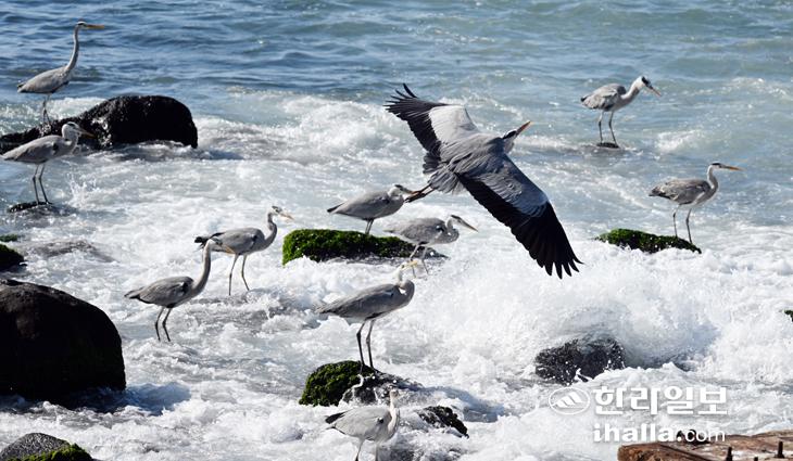 [한라일보] 9일 서귀포시 대정읍 해안도로 바닷가에서 배고픈 왜가리들이 먹이 사냥을 하고 있다. 강희만기자