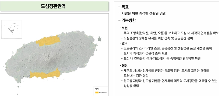 [한라일보] 한라산 해발고도 200m 미만 행정동 도시지역과 우도·추자면을 제외한 읍면사무소 소재 도시지역이 각각 '도심경관 권역'과 '읍면 중심지 경관 거점'으로 새롭게 지정돼 각 권역별로 경관 가이드라인을 준수하면 인센티브가 부여된다.