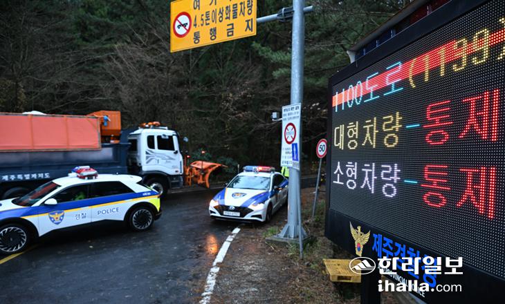 [한라일보] 한라산 중산간지역에 많은 눈이 내린 14일 제주시 어승생 삼거리 1100도로 입구에서 경찰이 차량을 통제하고 있다. 강희만기자
