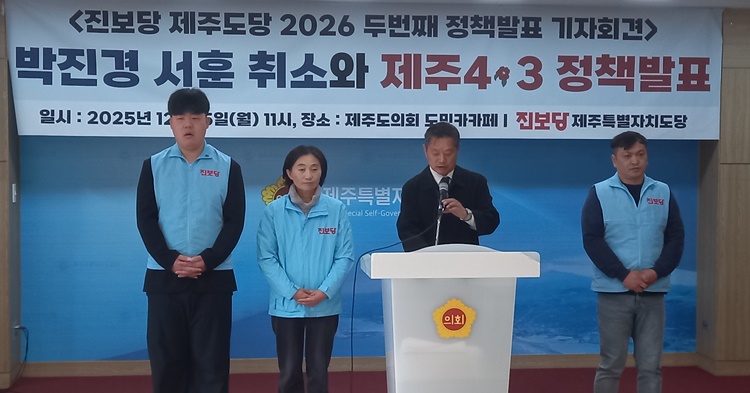 [한라일보] 진보당 제주도당은 15일 제주도의회 도민카페에서 기자회견을 열고 "이재명 대통령의 박진경에 대한 국가 서훈 취소 결단을 환영한다"며 4·3특별법의 조속한 개정을 촉구했다.
