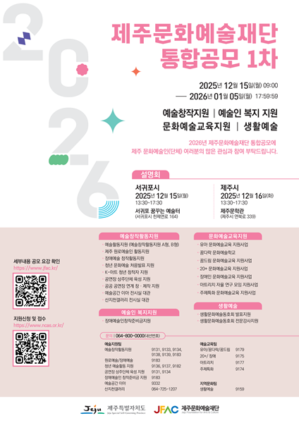 [한라일보] 제주문화예술재단이 2026년도 지원사업 1차 통합공모를 진행한다. 접수 기간은 내년 1월 5일까지이며, 문화예술교육 지원사업은 내년 1월 9일까지 접수받는다.