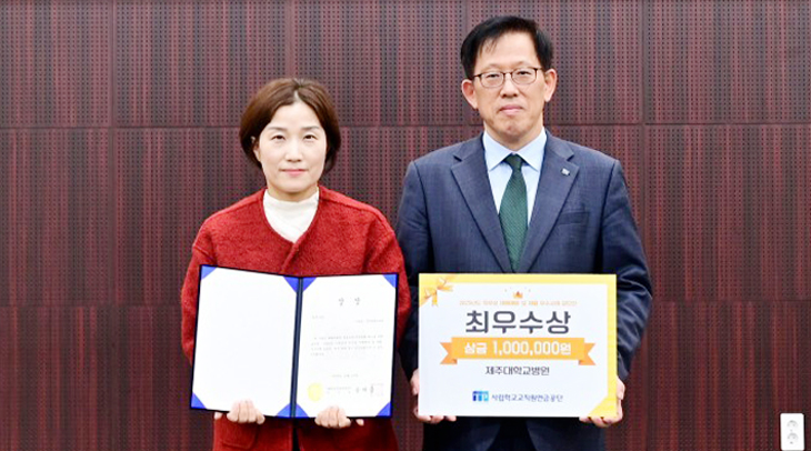 제주대학교병원(병원장 최국명)이 사립학교교직원연금공단(이사장 송하중)이 주최한 '2025년 직무상 재해예방 및 재활 우수사례 공모전'에서 최우수상을 수상했다.