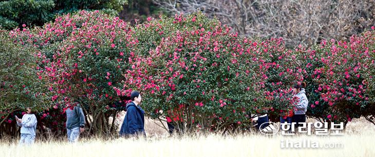 [한라일보] 16일 제주시 구좌읍 송당리 한 카페를 찾은 관광객들이 애기동백숲을 보며 제주 겨울 정취를 만끽하고 있다. 강희만기자