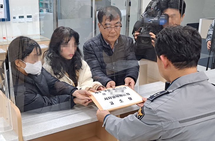 숨진 쿠팡 배송기사의 유족 측이 17일 제주경찰청을 찾아 음주운전 의혹을 제기한 모 영업점 대표의 사자명예훼손 내용의 고소장을 제출하고 있다.