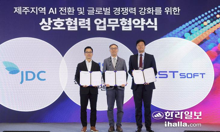 지난 10월 JDC, 카이스트, 이스트소프트가 '제주 지역 AI 전환과 글로벌 경쟁력 강화를 위한 상호 협력 업무 협약'을 체결하고 있다. 제주국제자유도시개발센터 제공