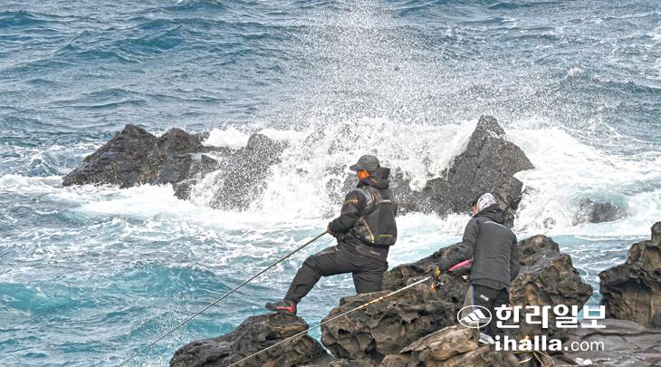 [한라일보] 17일 제주시 애월읍 구엄리 해안에서 낚시꾼들이 강한 바람과 높은 파도 속에서 낚시를 즐기고 있다. 강희만기자