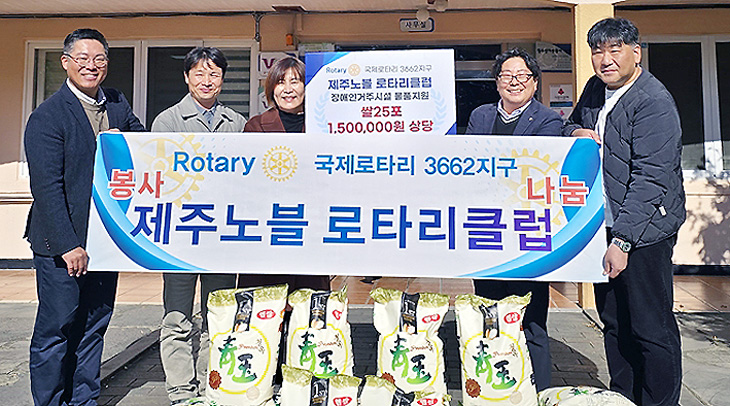 제주노블로타리클럽(회장 김기한)은 지난 9일 김기한 회장을 비롯한 회원 10여 명이 참석한 가운데 지적장애인 거주시설인 '아가의집'을 방문해 150만원 상당의 쌀을 전달했다.