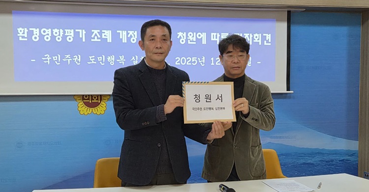 본부는 이날 '제주특별자치도 환경영향평가 조례 개정 청원서'를 제주도의회에 제출하며 "현행 제도는 기후환경부의 예규보다도 후퇴해 있거나 제주 실정에 맞지 않는 부분이 많다"며 "제2공항, 애월포레스트 등 대규모 개발 사업마다 반복되는 환경 갈등은 결국 부실한 제도 때문"이라 지적했다.
