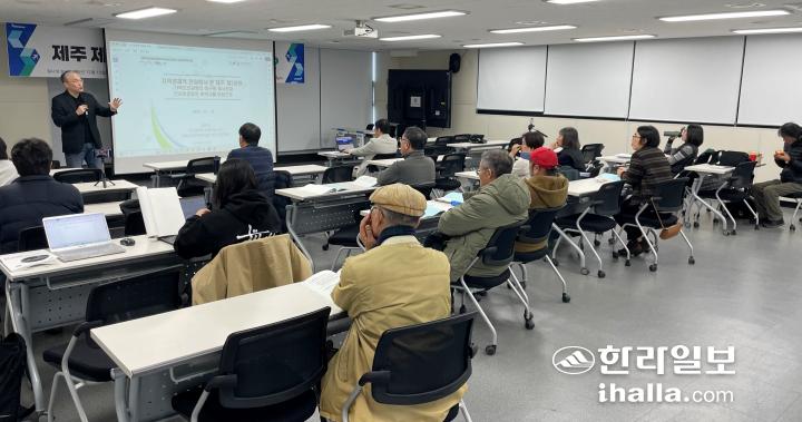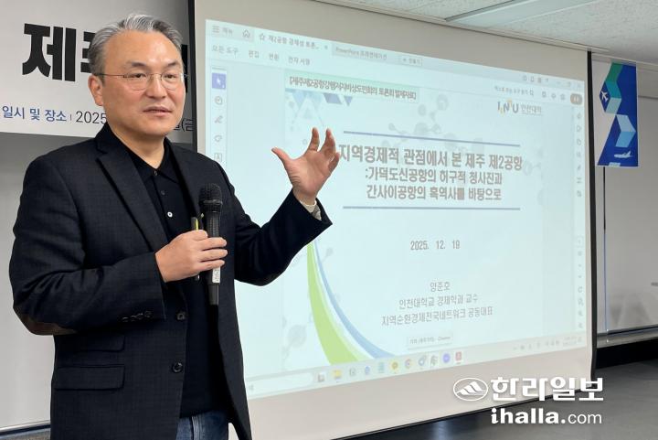 19일 ‘제주 제2공항 경제적 타당성 연속 토론회’에서 양준호 인천대학교 경제학과 교수가 발제하고 있다. 양유리기자