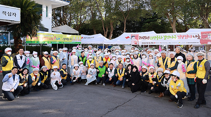 대한적십자사제주특별자치도지사(회장 정태근)는 지난 18일 적십자사 앞마당에서 LH 임직원 및 적십자 봉사원 등 130여 명이 참여한 가운데 '2025사랑의 김장김치 나눔' 사업을 실시했다.