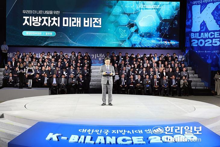 윤호중 행안부 장관이 지난달 19일 울산에서 열린 '2025 대한민국 지방시대 엑스포' 지방자치 및 균형발전의 날 기념식에서 '지방자치 미래비전'을 발표하고 있다. 행안부 제공