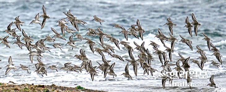 [한라일보] 22일 제주시 구좌읍 종달리 해안에서 민물도요 무리들이 한꺼번에 날아오르며 화려한 군무를 선보이고 있다. 강희만기자