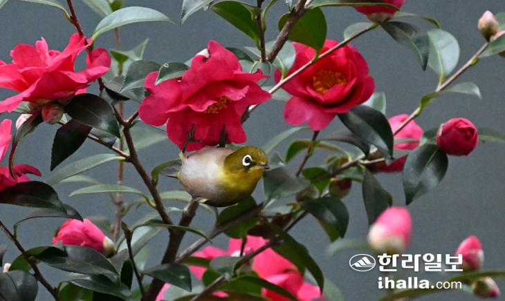 12월 활짝 핀 애기동백꽃과 동박새. 한라일보DB