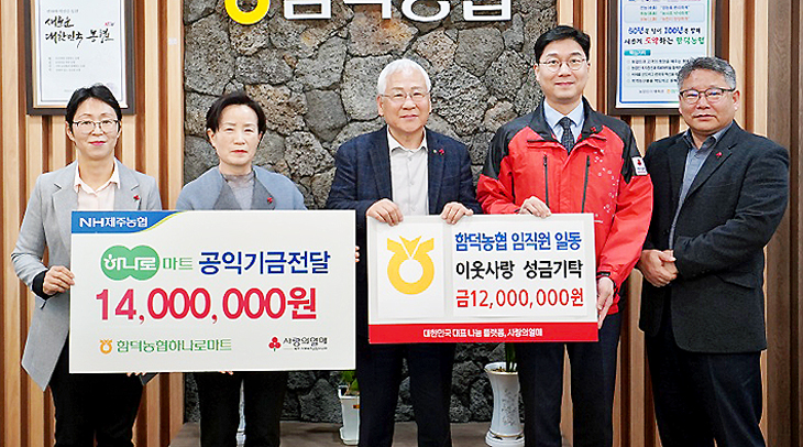 함덕농협(조합장 현승종)은 최근 함덕농협하나로마트 본점에서 하나로마트 공익기금과 임직원 성금을 포함한 총 2600만 원을 제주사회복지공동모금회(회장 강지언)에 기탁했다.
