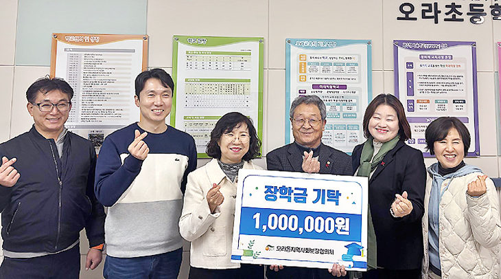 제주시 오라동지역사회보장협의체(공동위원장 진영진·강리선)는 지난 24일 오라초등학교를 방문해 어려운 가정의 아동을 위한 장학금 100만원을 기탁했다.