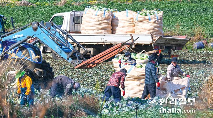[한라일보] 30일 서귀포시 대정읍 하모리 농경지에서 농민들이 양배추 수확 작업을 하고 있다. 강희만기자
