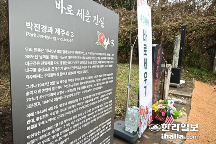 지난 15일 박진경 대령 추도비 바로 옆에 ‘바로 세운 진실’ 안내판이 설치됐다. 강희만기자