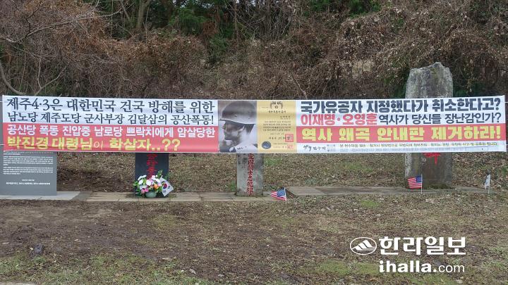 31일 제주시 어승생 한울누리공원 인근 도로변에 있는 박진경 추도비와 진실의비 바로 앞에 4·3 왜곡 현수막이 게재됐다. 양유리기자
