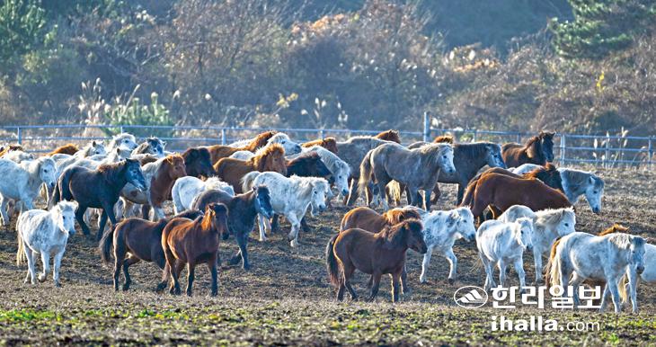 제주마들이 제주축산진흥원 초지에서 뛰놀고 있다. '제주의 제주마'는 지난 1986년 국가지정문화재 천연기념물 제347호로 지정됐다. 강희만기자