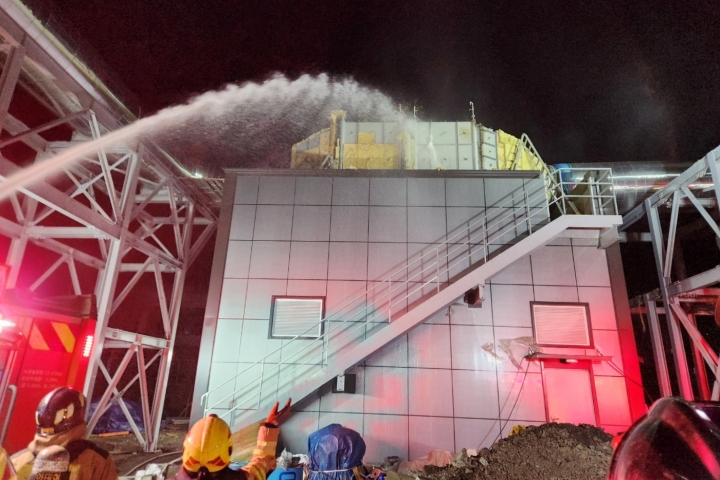 지난 5일 오후 제주시 구좌읍 동복리의 한 자원순환시설에서 화재가 발생해 소방당국이 진화에 나섰다. 제주소방안전본부 제공
